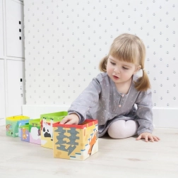 Lahke, a čvrste kartonske kocke dobro ležijo v otroških rokah in so varne za majhne prstke. Po igri jih preprosto vložite eno v drugo in prenesete v priročni škatli z ročajem. Največja kocka ima stranico 13 cm, najmanjša 4 cm – idealne velikosti za postopno učenje in veselje ob uspehu.