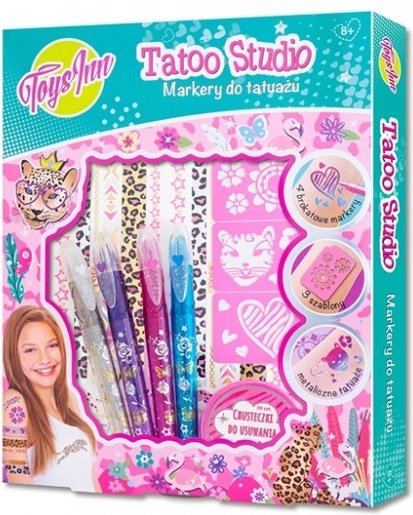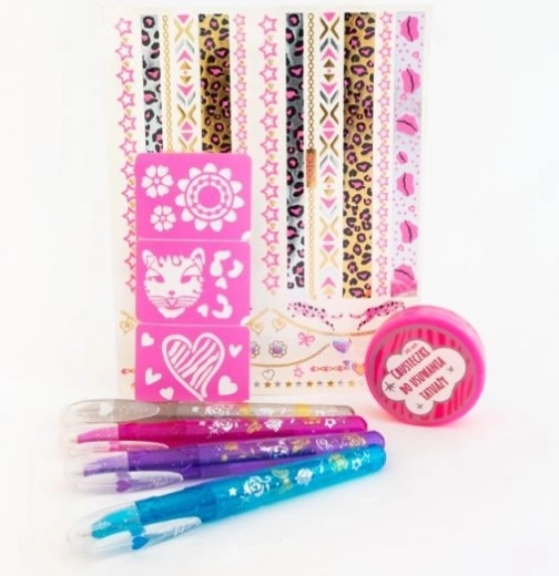 - Komplet tetovažnih flomastrov vsebuje: 4 bleščeče flomastre za tetoviranje, 3 šablone, 1 list kovinskih tetovaž, 30 robčkov za odstranjevanje tetovaž.