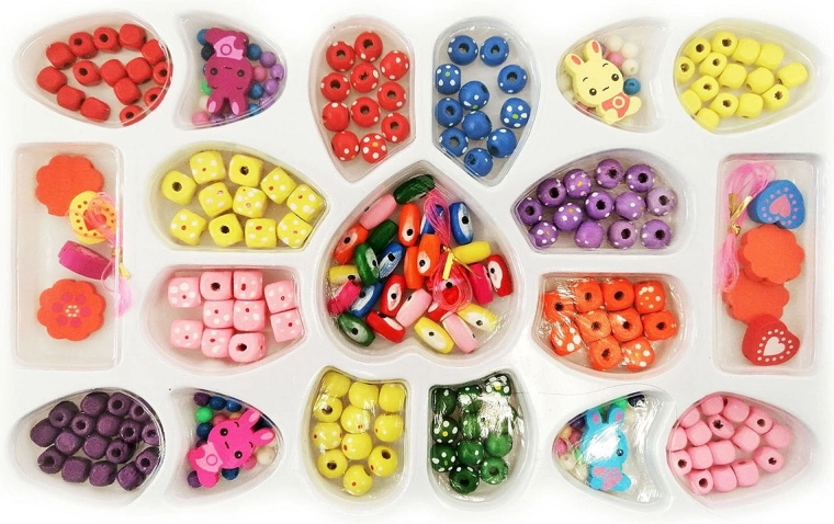 Iz seta lahko ustvarite zanimiv nakit – dovolj je, da nanizate kroglice in zavežete konce. Set ponuja neomejene možnosti za oblikovanje lastnih vzorcev.