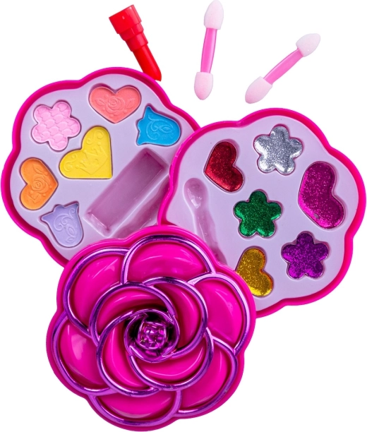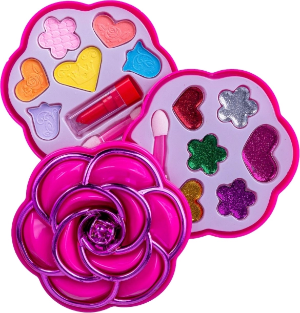 Ljubek kozmetični set za male princeske v obliki cveta prinaša prve korake v svet ličenja. Vsebuje dve nadstropji senčil za oči – bleščeča in brokatna ter pastelne odtenke – in rdečo šminko. Kompaktno ohišje v priljubljeni rožnati barvi se po zapiranju zlahka pospravi v torbico male dame.