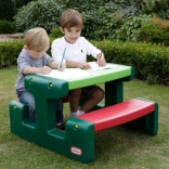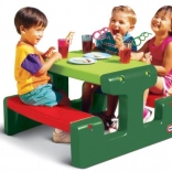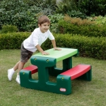 Praktična otroška piknik mizica LITTLE TIKES v kombinaciji zelene in rdeče barve ponuja stabilno površino za igro in obedovanje ter udobne vgrajene klopi. Je odporna na vremenske vplive, preprosta za čiščenje in je zaradi zaobljenih robov varna za otroke. Pri mizi se lahko hkrati udobno igrajo ali malicajo do štirje otroci.