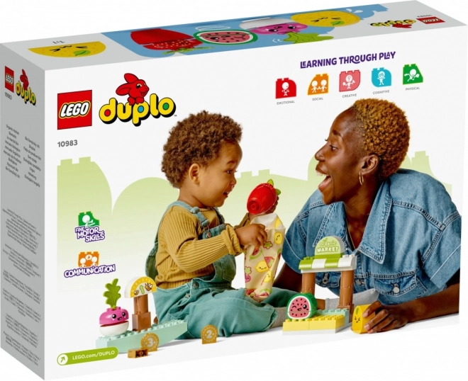 Lego Duplo Bio kmečka tržnica je popolna izobraževalna igrača, polna zabave. Set vključuje lubenico, limono, redkvico in jagodo, vse z različnimi izrazi na obrazu, tehtnico, tri kovance in tekstilno vrečko.