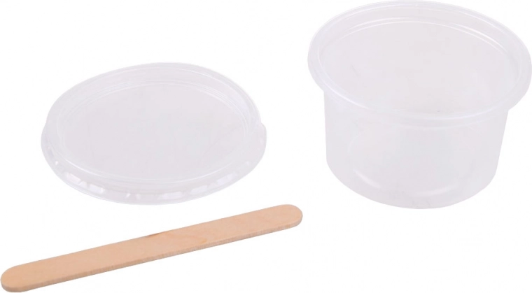 Prozorna posodica s pokrovčkom ohrani sluz svežo in prožno. Lesena lopatica omogoča čisto in udobno mešanje.