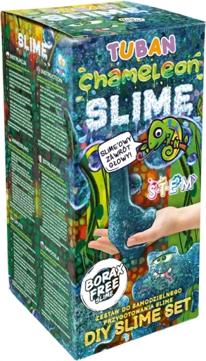 Ustvarite svojo bleščečo sluz s spreminjajočo barvo s kompletom TUBAN Super Slime Kameleon. Preprost postopek, varna sestava brez boraksa in vse potrebno v paketu: PVA lepilo, aktivator, kameleonski bleščice, mešalna paličica in posodica z zapiranjem. Sluz se blešči v milijonu bleščic, njen odtenek pa se spreminja glede na vpad svetlobe.