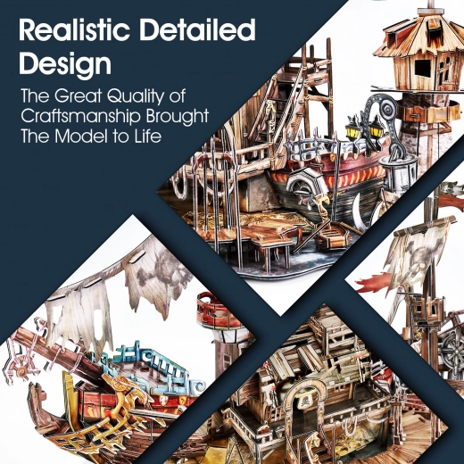 Odkrijte čar piratskega zaliva in ustvarite doma impresivno dekoracijo s 3D puzzli Piratsko pristanišče Tortuga. Model z merami približno 48 × 27 × 38 cm ponuja realistične podrobnosti, ki oživijo svet piratov. Sestavljanje poteka brez lepila in škarij – predrezane dele preprosto izlomite iz plošče in jih po navodilih sestavite.