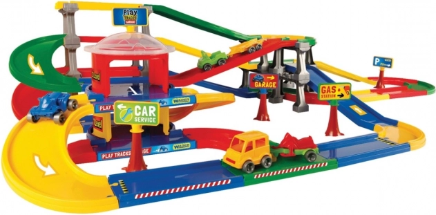 Ta parkirni kompleks iz serije Play Tracks Garage ima lahko konstrukcijo, ki omogoča sestavljanje prog v različnih oblikah in tako popestri otrokovo igro. Set vključuje dvonivojsko parkirišče in enajstmeterski poligon.