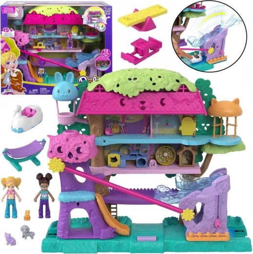 Odkrijte čarobni svet igre s setom Polly Pocket Hiška na drevesu, ki se razpre v super velik igralni prostor! Čaka vas 5 nivojev zabave, zipline, slapasta toboganska steza, 2 mikrolutki POLLY in SHANI, 4 prisrčni ljubljenčki, 9 dodatkov ter labodji voziček za sprožanje presenetljivih funkcij.