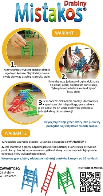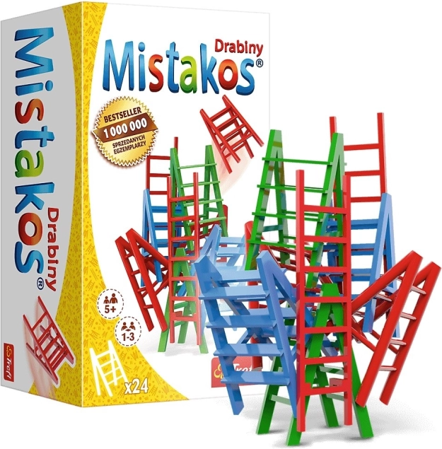 Zabavna družinska igra Mistakos: 24 lestev podjetja TREFL prinaša napeto sestavljanje majavega stolpa iz lestev v dveh igralnih načinih. Vadi spretnost, logično razmišljanje in poskrbi za odlično družabno zabavo za otroke in odrasle.
