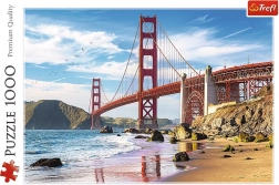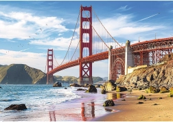 Vsiljiv posnetek slavnega mostu v San Franciscu s kontrastom rdeče konstrukcije in modrega neba poživi vsako zbirko sestavljank.