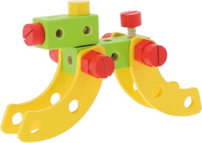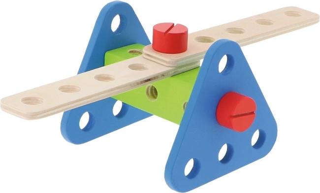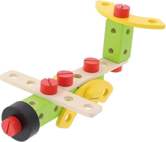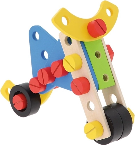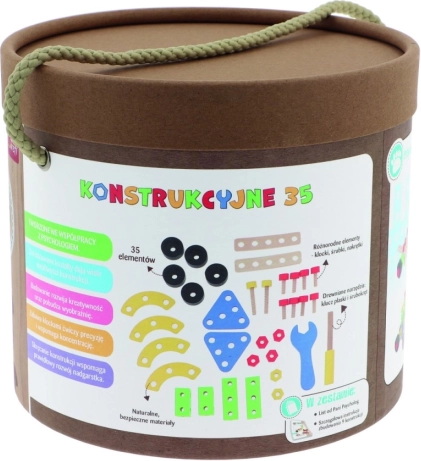 V kompletu je 35 elementov: kocke, vijaki in orodje ter priročnik s predlogi za sestavljanje najrazličnejših konstrukcij.