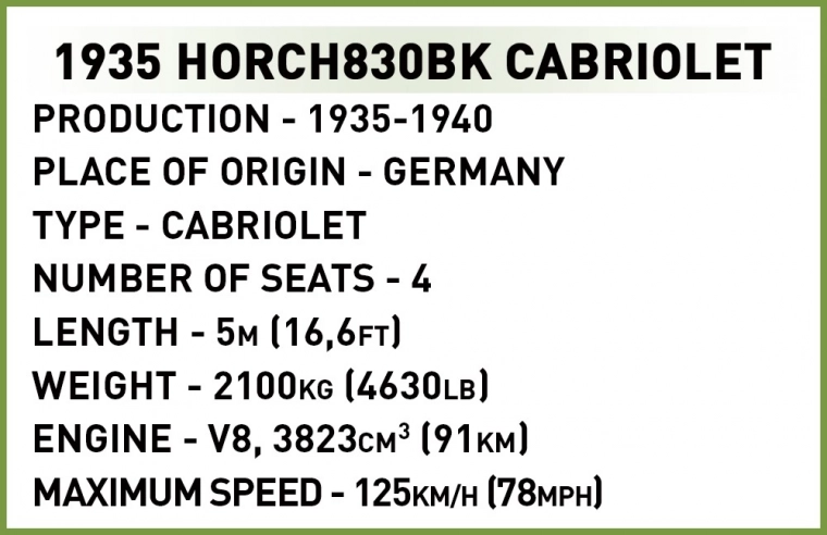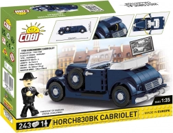Ta realistični gradbeni komplet prikazuje skrajšano različico legendarnega vozila HORCH 830BK, znanega po kakovosti in tehničnih inovacijah. Posebej zasnovani elementi za modele vozil zagotavljajo verne proporcije in številne presenetljive podrobnosti. Trajni tiski namesto nalepk modelu zagotavljajo vrhunski videz in odpornost pri igri.