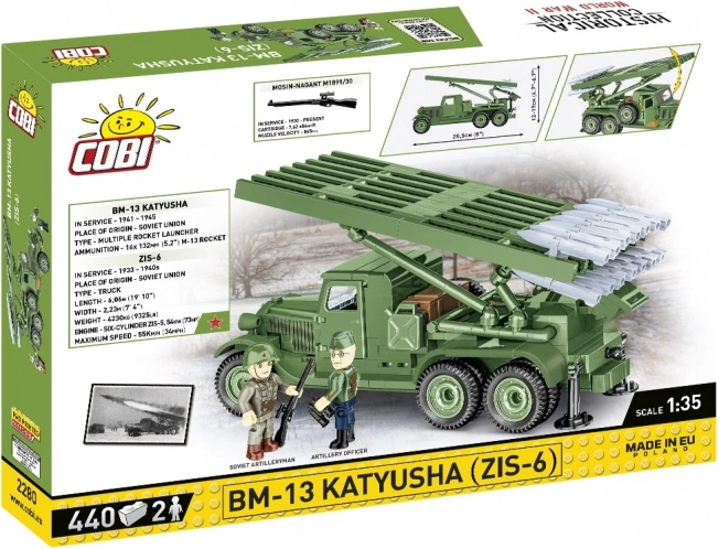 Zgradite eno najbolj ikoničnih orožij druge svetovne vojne – BM-13 KATJUŠA, imenovano tudi »Stalinove orgle«. Ta tirnična raketnica M-13, nameščena na tovornjaku ZIS-6, je slovela po uničujočem salvo ognju in psihološkem učinku, kljub manjši natančnosti posameznih raket. V resnici so rakete M-13 glede na različico dosegle več kot 9 km dometa.
