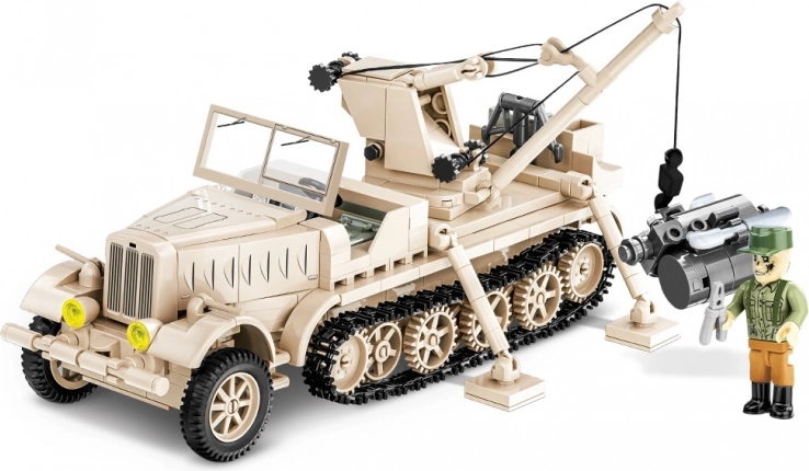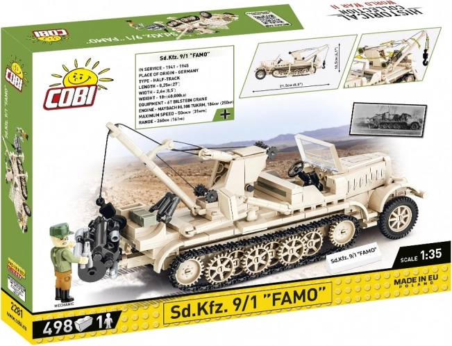 Gradbeni komplet Sd.Kfz. 9/1 Famo 1:35 iz 498 koščkov s funkcionalnimi gosenicami, vrtljivim dvigalom in kakovostnimi potiski. Idealno za diorame in ljubitelje zgodovine.