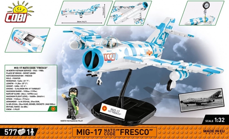 Ta realističen gradbeni komplet predstavlja slovitega lovca MiG‑17 (na Poljskem izdelovan kot LIM‑5), ki je služil v letalstvih več kot 40 držav. Privlačna kamuflaža, navdihnjena z eksponatom iz muzeja na letalonosilki USS Intrepid, bo izstopala v vsaki zbirki letalstva, hladne vojne ali Vietnam War.