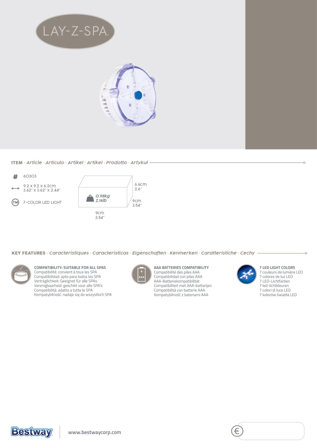 Ta LED svetilka za bazen Bestway zagotavlja domiselno osvetlitev vode, kar ustvarja izjemno vzdušje po mraku. S sedmimi barvami svetlobe bodo vaš bazen ali jacuzzi pridobili privlačen večerni videz.