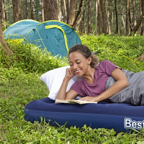 Praktičen napihljiv ležalnik za eno osebo z merami 185 × 76 × 22 cm znamke BESTWAY je idealen za doma in na poti. Ima prijetno velur površino, odporno konstrukcijo coil-beam, varnostni ventil za enostavno napihovanje in izpihovanje, v paketu pa najdete tudi samolepilni obliž.