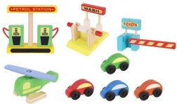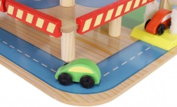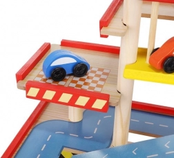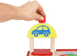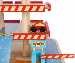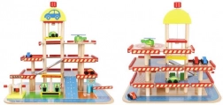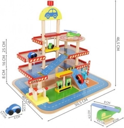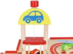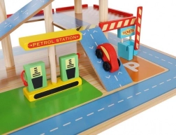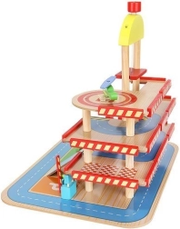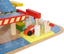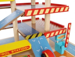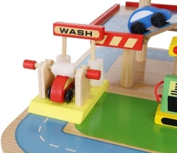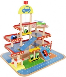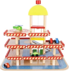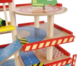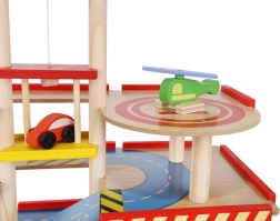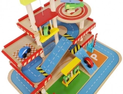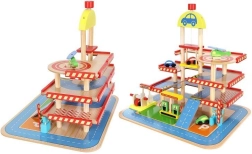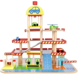 Odkrijte robustno leseno parkirišče z garažo, ki ponuja tri igralne etaže povezane z rampami, funkcionalno dvigalo in zgornji heliport. Otroci bodo uživali v realističnih elementih, kot so avtopralnica, bencinska črpalka in prodaja vozovnic, ki ustvarjajo pristne prometne scenarije.