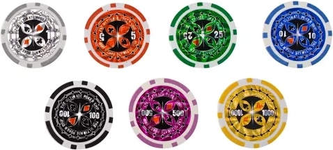Barvni žetoni s kovinskim obročem v notranjosti ponujajo idealno težo in odličen oprijem pri mešanju in stavljenju – kot v pravem kazinoju.