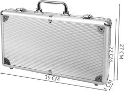 Priredite svoj poker večer s kompletom, ki ponuja vse potrebno za Texas Hold'em in druge kartne igre. Žetoni s kovinskim jedrom (10 g) prinašajo avtentičen kazino občutek – imajo prijetno težo, odlično se zlagajo in so zelo trpežni. Vse je shranjeno v čvrstem aluminijastem kovčku z penasto oblogo in natančno oblikovanimi predelki, zato vsebina ostane na mestu tudi med potovanjem.