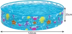 Specifikacije bazena vključujejo kapaciteto 277 litrov in dimenzije 122 cm x 25 cm, kar je idealno za majhne otroke. Izdelek tehta le 950 g, zato je enostavno obvladljiv in prenosljiv. Del paketa je tudi vodotesna popravilna zavesa, ki omogoča hitra popravila, tudi ko je bazen napolnjen z vodo.