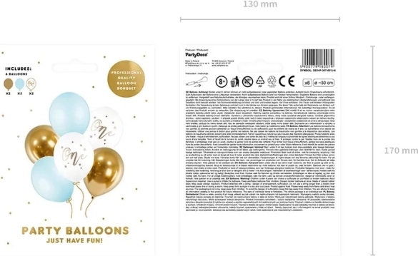 V pakiranju najdete 6 balonov s premerom približno 30 cm: 2x Pure White z zlatim potiskom »One«, 2x Light Blue in 2x bleščeče zlata. Zlahka jih kombinirate z drugimi dodatki za foto kotiček, sweet bar ali namizno dekoracijo.