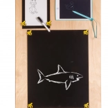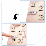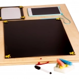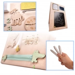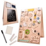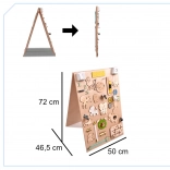 Posebna funkcija te deske je njena obojestranskost - ena stran vsebuje manipulativne elemente, druga pa služi kot površina za risanje in pisanje s kredami, flomastri ali svinčniki. To pomaga otrokom razvijati kreativnost in fino motoriko.