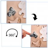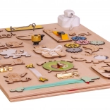 Deska vsebuje pisana zobata kolesca, zvončke, ključavnice in druge interaktivne elemente, ki spodbujajo razvoj fine motorike.