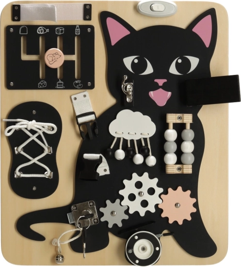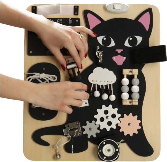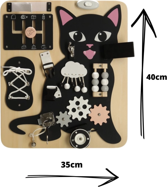 Tabla Lulilo v obliki mačke je priljubljena izobraževalna igrača za otroke, ki jih spodbuja k vrtenju, vlečenju, vezanju in premikanju. Pomaga jim razvijati fino motoriko, natančnost gibov in moč v rokah. Zabavne uganke in naloge stimulirajo kognitivne sposobnosti majhnih otrok in jim prinašajo zadovoljstvo ob uspehih.