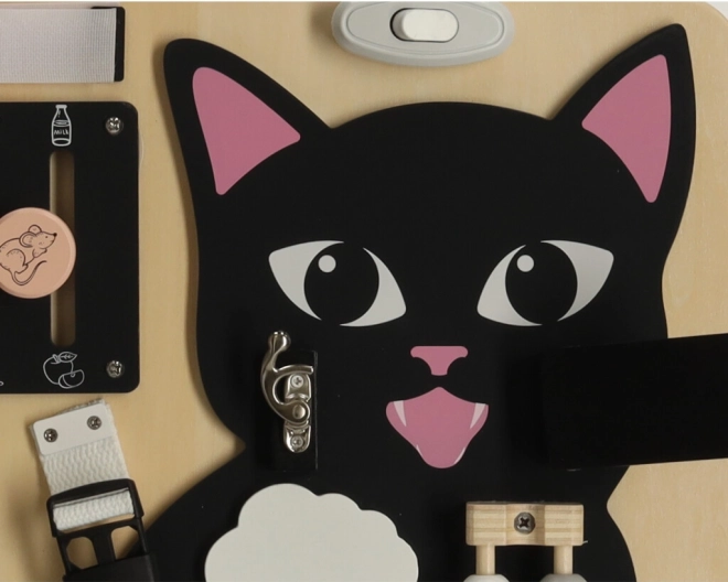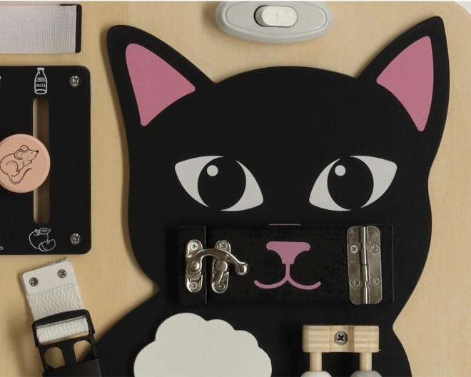 Kombinacija črne mucke s svetlimi lesenimi detajli privablja pozornost in otroka zabava dolge ure.