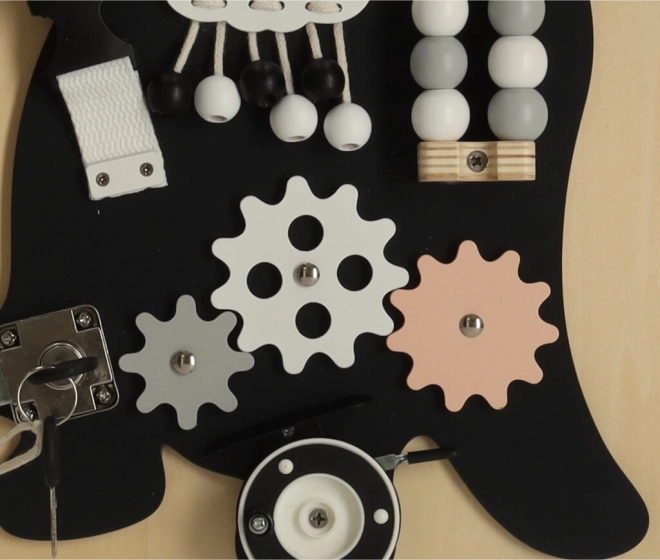 Z uporabo interaktivnih elementov, kot so prestave, ključavnice in vezalke, se otroci učijo fine motorike in si izboljšujejo natančnost gibov rok.