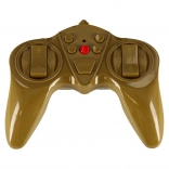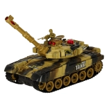 RC tank v puščavski izvedbi ponuja gladko vožnjo naprej/nazaj, obračanje na mestu in vrtljiv stolp za 180° na vsako stran (skupaj 360° strelski sektor). Mehke gumijaste gosenice zagotavljajo dober oprijem na različnih podlagah. Ob strelu tank simulira realističen povratni sunek ter spremljevalne zvoke motorja in streljanja.