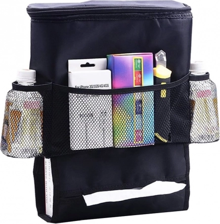 Ohranite notranjost vozila popolnoma urejeno s praktičnim organizatorjem za zadnjo stran sedeža z integrirano termo torbo. Ponuja velik izoliran predal na zadrgo za ohranjanje pijač in hrane pri optimalni temperaturi, 3 mrežaste žepe za drobnarije in steklenice ter spodnji žep za robčke. Enostavno se namesti, dobro prilega sedežu in hkrati ščiti naslonjalo pred umazanijo.