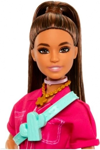 V kompletu je vrsta barvitih dodatkov – sončna očala s polovičnimi lečami, rožnat naglavni trak, ogrlica z zvezdo, zapestnica, pas z motivom kaktusov in torbica z retro grafiko »Good Day«. Punčka ne stoji samostojno. Barve in podrobnosti se lahko razlikujejo.