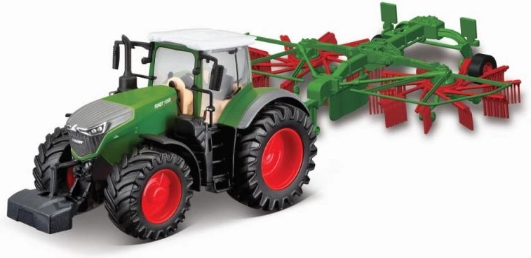Model kmetijskega traktorja Bburago Farm Traktor Fendt 1050 Vario z obračalnikom (obračalnik/trajnik sena), izdelan iz kovinskih in plastičnih delov, temelji na predlogi traktorja, ki predstavlja vrhunsko serijo 1000 Vario.