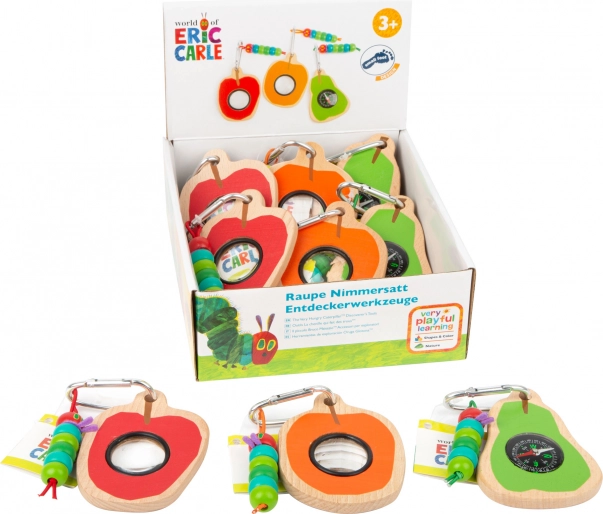 Odkrijte svet s prikupnim raziskovalnim orodjem small foot z motivom gosenice. Združuje lupo za raziskovanje podrobnosti in kompas za orientacijo na terenu. Zahvaljujoč praktični karabinki ga zlahka pripnete na nahrbtnik ali pas. Trpežna lesena izvedba je idealna za male raziskovalce od 3 let dalje.
