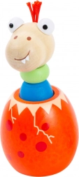 Dizajn veselega bitja, ki kuka iz barvitega jajčka, vabi k domišljijski igri in podpira naravni razvoj čutov. Kompaktne mere se odlično prilegajo majhni ročici ter olajšajo prijem in prve manipulacije.