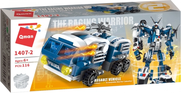 Odkrijte akcijsko zabavo s sestavljanko Qman Raging Warrior – bojno vozilo s 116 deli, ki jih je mogoče kombinirati z drugimi seti. Sestavite podroben model policijske tehnike in z združevanjem modelov iz serije ustvarite velikega robotskega varuha reda. Kocke iz odporne in neškodljive ABS plastike so popolnoma kompatibilne z LEGO, Sluban, Cobi in drugimi znamkami.