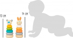 Brezčasna lesena igrača, ki raste z vašim otrokom. Otroci razvrščajo in natikajo obročke na palico, jih zlagajo po velikosti in odkrivajo barve. Figurici zajčka in medveda motivirata k igri in hkrati krasita otroško sobo s svojim nežno pastelnim videzom.