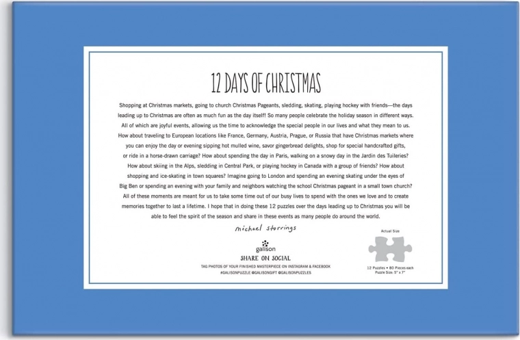 Vse sestavljanke imajo enak format z dimenzijami približno 12,7 × 17,8 cm in so sestavljene iz 80 koščkov – idealna dolžina za vsakodnevni praznični ritual. Vključena je tudi dvostranska predloga z vseh 12 motivi za še lažje sestavljanje.