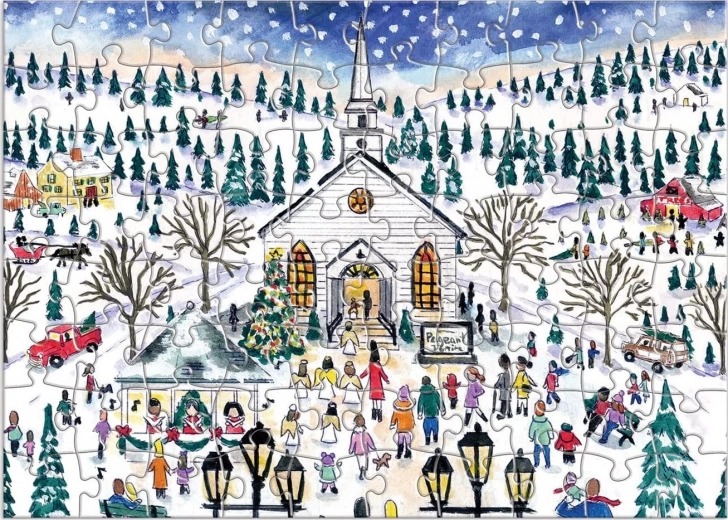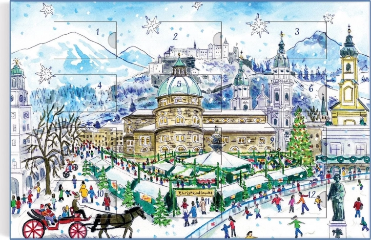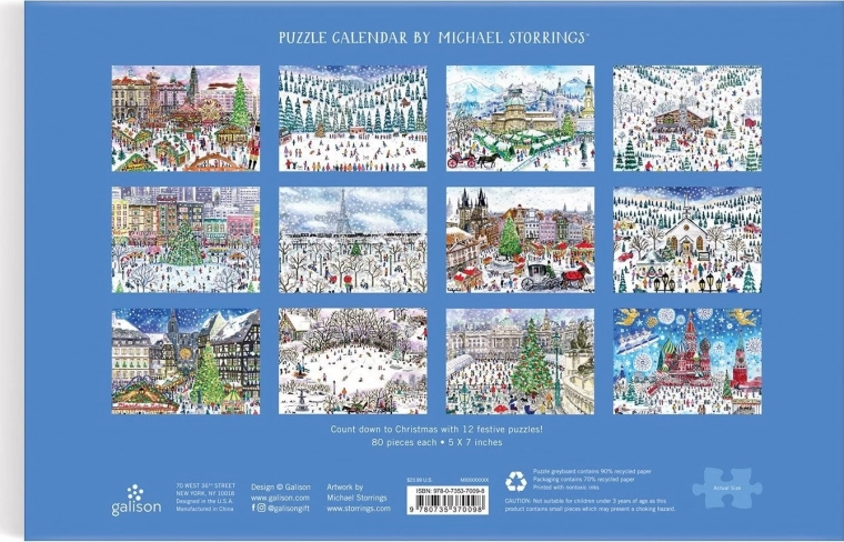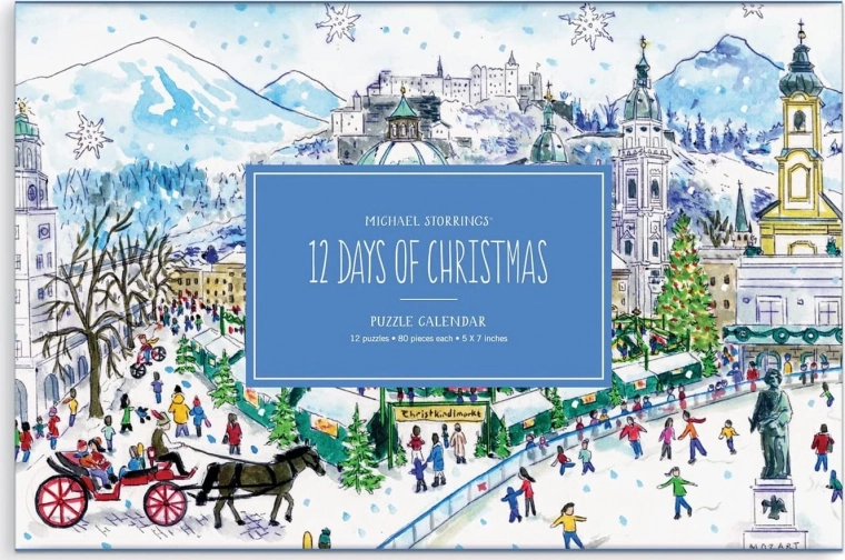 Ta izvirni adventni koledar združuje praznično okrasitev z sproščujočo zabavo za male in velike. Po izvleku zunanjega ovitka se prikaže notranja plošča z 12 okenci, za katerimi se skrivajo ilustrirane sestavljanke. Vsak motiv ujame duha božiča po vsem svetu v prepoznavnem slogu Michaela Storringsa.