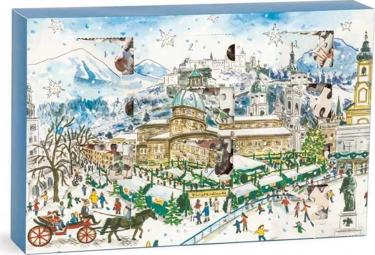 Odpirajte 12 oštevilčenih okenc in vsak dan sestavite nov zimski motiv. Vsaka sestavljanka ima 80 koščkov in enake dimenzije za udobno vsakodnevno sestavljanje.