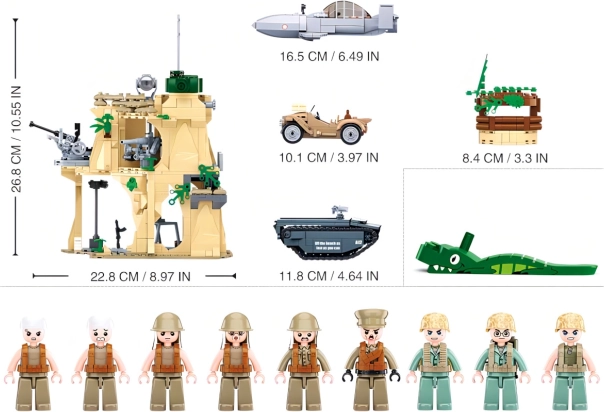 Minifigurice imajo vrtljive in gibljive dele telesa za naravno poziranje. Vključeno orožje in dodatki za avtentičen vojaški videz.