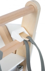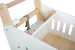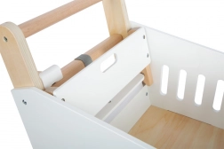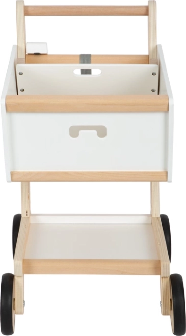 Ta otroški nakupovalni voziček je izdelan iz trdnega lesa in opremljen z gumiranimi kolesci za tiho in gladko gibanje. Tako kot v resničnem supermarketu je na voljo možnost uporabe magnetnega žetona v držalu. Voziček ponuja prostorno košarico za različne predmete ter dodaten prostor za shranjevanje na spodnjem delu.