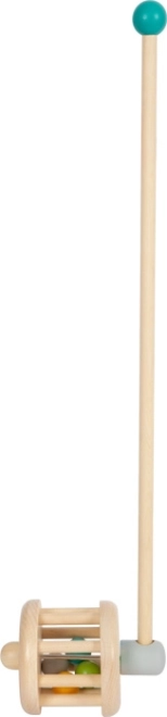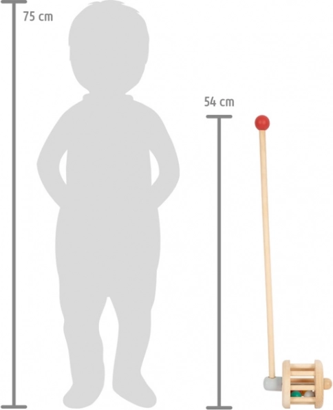 Ta leseni potiskač služi tudi kot ropotuljica in je varen ter trpežen spremljevalec za vsakogar malčka. Pisane kroglice ob pritisku na potiskač divje poskakujejo okoli lesenega bobna in oddajajo zabaven zvok.