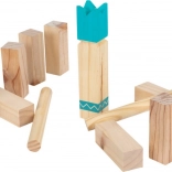 Kakovostne lesene kocke, kralj in kmeti zdržijo pogosto igranje na prostem. Stabilne oblike in prijetna površina zagotavljajo udoben oprijem in natančne mete.