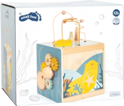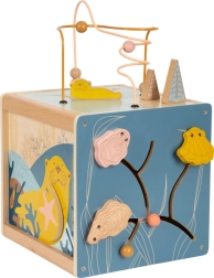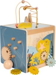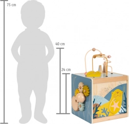 Ta oblikovalska motorična kocka združuje naravni les in nežne morske motive za igrivo učenje. Dva kroglična labirinta na vrhu, drsne steze, ogledalca in majhne lopute vabijo k raziskovanju, medtem ko zobniška kolesca z zvezdami in mehka meduza spodbujajo prepoznavanje oblik in vzročno-posledičnih povezav. Odstranljiv pokrov lahko shranite v notranjost kocke za prihranek prostora.