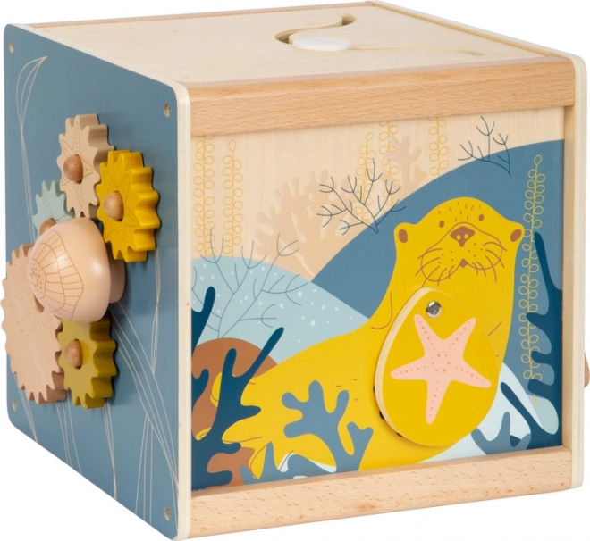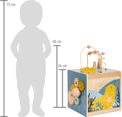 Vsestranska lesena motorična kocka z morskim motivom znamke Small Foot ponuja 5 igralnih ploskev, dve kroglični labirinti, vrtljiva zobniška kolesca z odstranljivimi zvezdami in mehko meduzo za razvrščanje oblik. Spodbuja fino motoriko, koordinacijo oko–roka in čutno zaznavanje. Odstranljiv pokrov prihrani prostor pri shranjevanju, varni zaobljeni robovi in kakovostna lesena izdelava v modnih barvah razveselita otroke in starše.