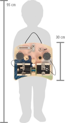 Ta stilska montessori »busy board« v prijetnih pastelnih barvah ponuja otrokom številne možnosti raziskovanja. Različne ključavnice in zapahi, znani iz vsakdanjega življenja, zobata kolesa z mini labirintom, navojna palica z vrtljivimi elementi ter zabaven trobilni hupa razvijajo spretnosti skozi igro in spodbujajo k naravnemu učenju.