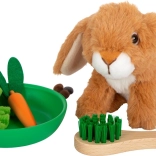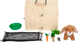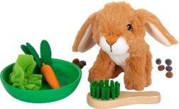Del seta je plišasti zajček in praktični dodatki: metlica, skledica, lesena korenček, košček solate in filcani »kakci« za avtentične prizore nege. Set je idealna alternativa za otroke, ki si za zdaj ne morejo omisliti pravega ljubljenčka, ter jim pomaga razvijati družbene in čustvene veščine.