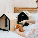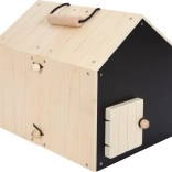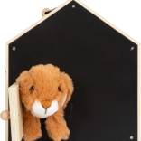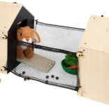 Premišljeni zajčnik iz kakovostnega lesa ponuja dve ločeni hišici – eno za miren spanec in drugo z mrežastim okencem za opazovanje okolice. K hišicam lahko preprosto priključite žičnate ograje in tako ustvarite zunanji izpust za še bolj zabavno igro. Zadnjo črno steno je mogoče pisati s kredo, kar prinaša dodatno mero ustvarjalne interakcije.